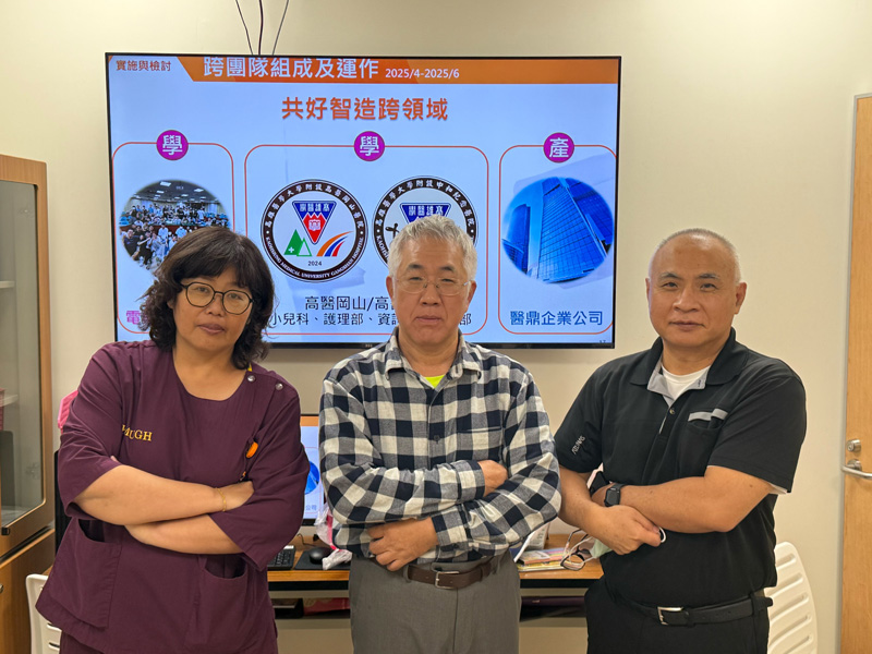 智慧尿布監控開發團隊(照片左起岡山醫院兒科病房護理長陳淑芬、電機系吳榮慶老師、資工系王三元老師)。