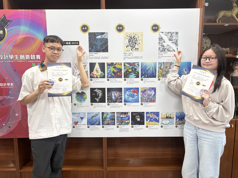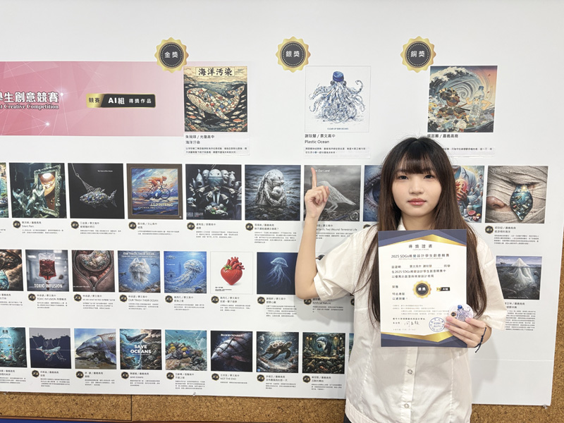 「AI組」金獎由光復高中朱婉琪奪得,作品《海洋污染》以浮世繪工筆風格描繪海洋垃圾對生態的威脅,透過暗色巨鯨與群魚的強烈對比,揭示美麗表象下潛藏的污染真相,喚起大眾守護海洋的共同責任;銀獎由景文高中謝玟慧獲得,其作品《Plastic Ocean》以塑膠垃圾拼組成章魚形象,象徵海洋已逐漸被人類廢棄物佔據,呼籲社會正視日益嚴峻的海洋污染問題;銅獎則由嘉義高商侯芸蓁榮獲,作品《武海》以武士揮刀守護遭塑膠吞噬的海洋為意象,點出人類在環境保護中責無旁貸的角色。「一般組」金獎得主為華南高商陳永源,作品《悠油海洋》以油污蔓延的海洋景象,對比冷漠航行的豪華遊艇,犀利批判人類對生態破壞的忽視;銀獎由三重高中蕭丞希獲得,其作品《守護心》結合寫實心臟與日常生活及醫療照護意象,呈現健康來自於每一天細微卻持續的守護;銅獎則由育達高中秦子媗奪得,作品《海洋生態》將人類丟棄的垃圾排列成海鳥形狀,隱喻污染對海洋生物造成的威脅,提醒正視污染所帶來的長期影響。本屆得獎作品題材多元、表現手法各異,卻共同展現年輕學子對環境保護與永續發展議題的高度關注,以及以創意設計回應社會責任的深刻思考。此外視設系於 2 月 11 日至 3 月 1 日於高雄市岡山文化中心藝文廊道辦理「2025 國際 SDGs 永續視覺設計邀請展暨學生創意競賽成果展」,邀集來自全球約十個國家的設計師、藝術家與教授之作品,與學生得獎作品共同展出,期盼透過設計競賽與展覽平台,為永續發展注入創意動能。