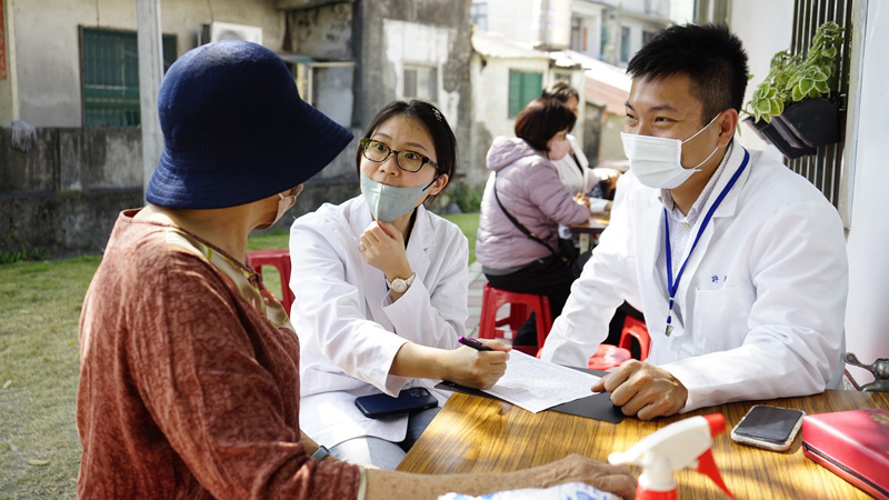 醫療服務隊初診組員耐心詢問里民狀況,透過細心紀錄與觀察,確保長者獲得精準的初步醫療評估,展現後中醫系學子視病如親的服務熱忱。(資料畫面來源:義守大學提供)
